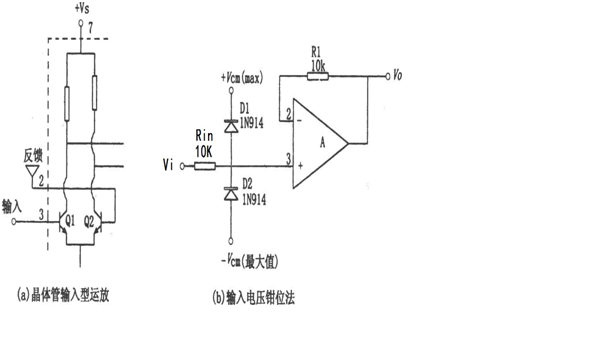 消除阻塞現(xiàn)象的方法一般可分為兩類:限制輸入電壓法和防止輸出瞬時過壓法。圖(b)所示電路即為限制輸入電壓鉗位法,圖中±Vcm為共模輸入電壓上、下限極限值,運用二極管D1和D2實現(xiàn)將輸入電壓鉗位在±Vcm之間。這個方法具有通用性。當(dāng)運放的電壓放大倍數(shù)大于l時,其鉗位電平值應(yīng)降低相應(yīng)的倍數(shù)。
