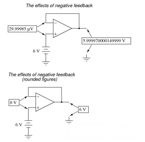 這個(gè)電路很快就會(huì)達(dá)到一個(gè)穩(wěn)定狀態(tài),輸出電壓的幅值會(huì)很準(zhǔn)確的維持運(yùn)放兩個(gè)輸入端之間的壓差,這個(gè)壓差Ve反過來會(huì)產(chǎn)生準(zhǔn)確的運(yùn)放輸出電壓的幅值。將運(yùn)放的輸出與運(yùn)放的反相輸入端連接起來,這樣的方式被稱為負(fù)反饋,這是使系統(tǒng)達(dá)到自穩(wěn)定的關(guān)鍵。這不僅僅適用于運(yùn)放,同樣適用于任何常見的動(dòng)態(tài)系統(tǒng)。這種穩(wěn)定使得運(yùn)放具備工作在線性模式的能力,而不是僅僅處于飽和的狀態(tài),全“開”或者全“關(guān)”,就像它被用于沒有任何負(fù)反饋的比較器一樣。