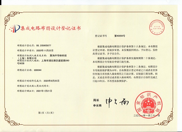 布圖名稱:GS8044,于2021年1月21日榮獲國(guó)家知識(shí)產(chǎn)權(quán)局集成電路布圖設(shè)計(jì)登記認(rèn)證。