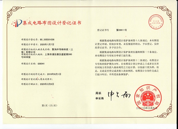 布圖名稱:GS8041,于2020年3月9日榮獲國(guó)家知識(shí)產(chǎn)權(quán)局集成電路布圖設(shè)計(jì)登記認(rèn)證。